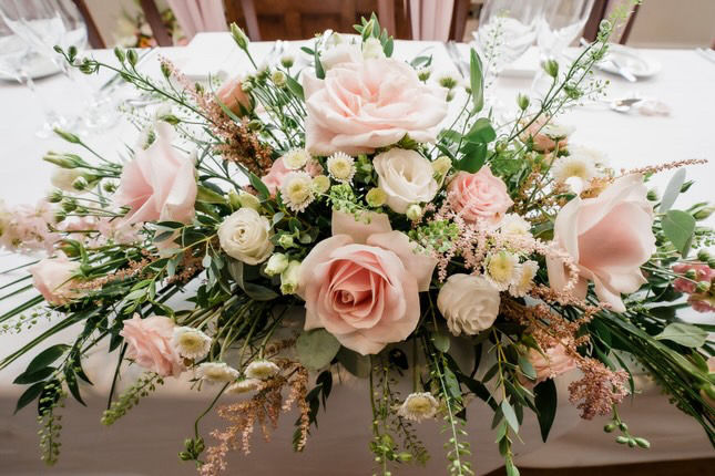 When guests entered the ballroom for the wedding breakfast, they were greeted with grand blush pink centrepieces that instantly elevated the space.
